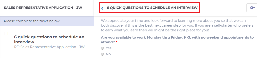 After applying for a position you may be asked to complete a "task". Tasks contain questions to find out more about you and provide you the opportunity to tell a little more about yourself that may not be found on your resume. Just follow these simple steps to complete your tasks!